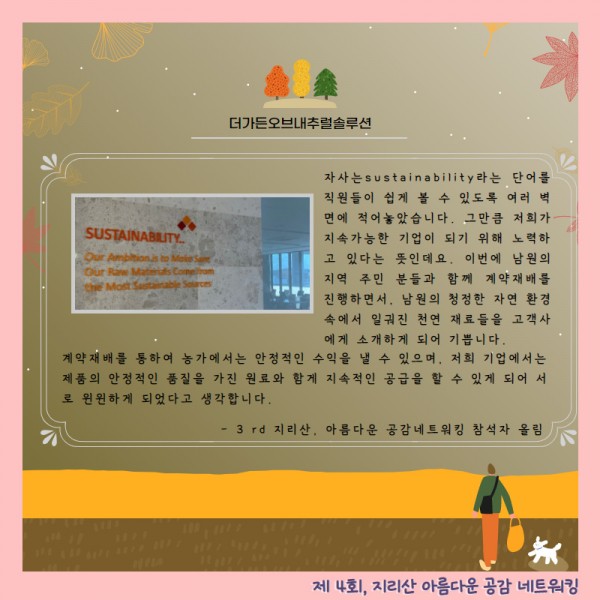 제 4회 지리산, 아름다운 공감 네트워킹 ((주)더가든오브내추럴솔루션) 페이지 정보 작성자 최고관리자 조회Hit 1,207회 작성일Date 20-11-03 본문 지리산이 전하는 자연과 사람의 공존 지속가능성을 찾아보는 시간공감하는 아름다운 마음이 하나되는 시간"지리산, 아름다운 공감 네트워킹"(주)더가든오브내추럴솔루션 ※ 이 내용은 저작권법에 따라 보호받는 저작물이므로 무단 전재와 무단 복제를 금지하며, 이 내용의 전부 또는 일부를 이용하려면 반드시 저작권자의 서면 동의를 받아야 합니다. 목록 이전글제 4회 지리산, 아름다운 공감 네트워킹 ((주)온유) 20.11.03 다음글제 4회 지리산, 아름다운 공감 네트워킹 ((주)루바마바이오랩) 20.11.03