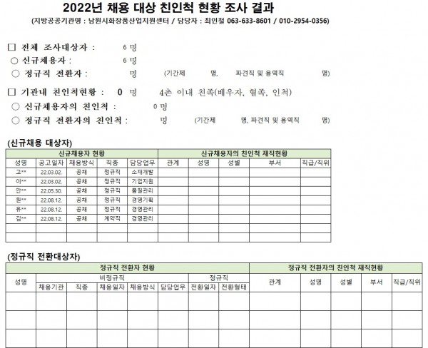 「지방출자출연기관 인사조직지침」에 따라 "2022년 신규채용 임직원의 친인척 수를 공개"합니다.